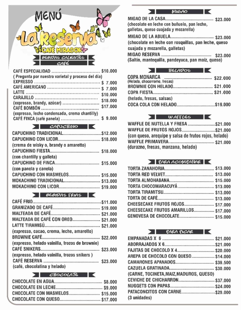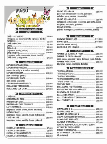 En La Reserva Café Mirador, nos preocupamos por ofrecerte una experiencia gastronómica única que complementa la magia del lugar. Desde bebidas calientes y frías hasta postres y opciones para picar, aquí encontrarás algo para todos los gustos.