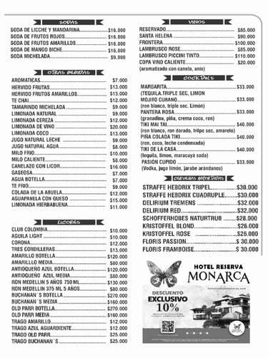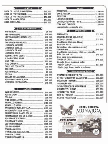 Licores como Aguardiente, Ron, Whiskey y Vinos.